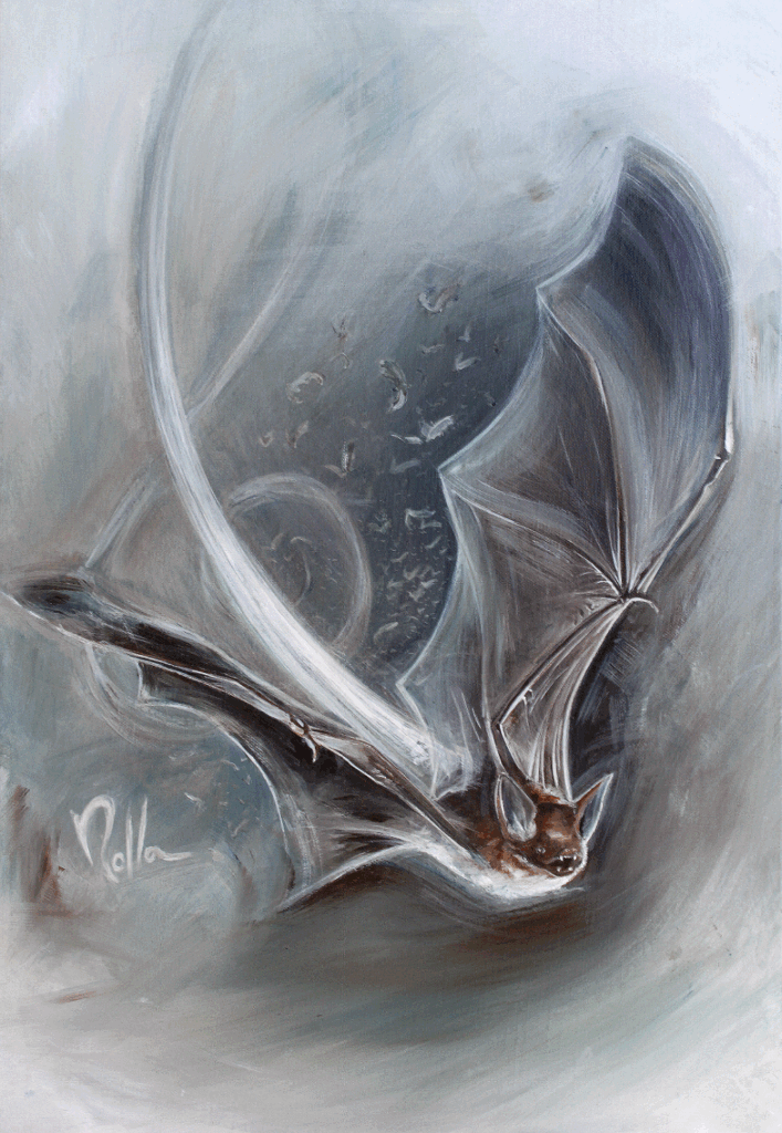 Dans cette composition graphique et expressive, la chauve-souris devient un symbole de l’écoute, du signal et de l’intuition, évoquant l’écholocation et la perception du son comme forme artistique. Le titre Echo Nocturne suggère une fusion entre observation naturelle et rythme visuel, caractéristique de l’univers Instinct Musical de Rolla, où chaque œuvre dialogue avec les motifs sonores et les émotions internes.