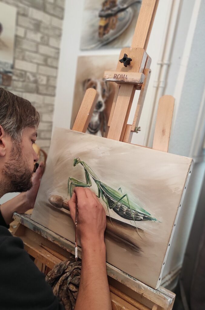 Dernière frappe - Mante religieuse acrylique - ROLLA - Artiste peintre