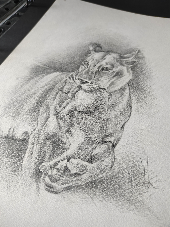 Dessin de recherche original et unique (1 unique exemplaire), fait à la main par l’artiste représentant une lionne et son lionceau