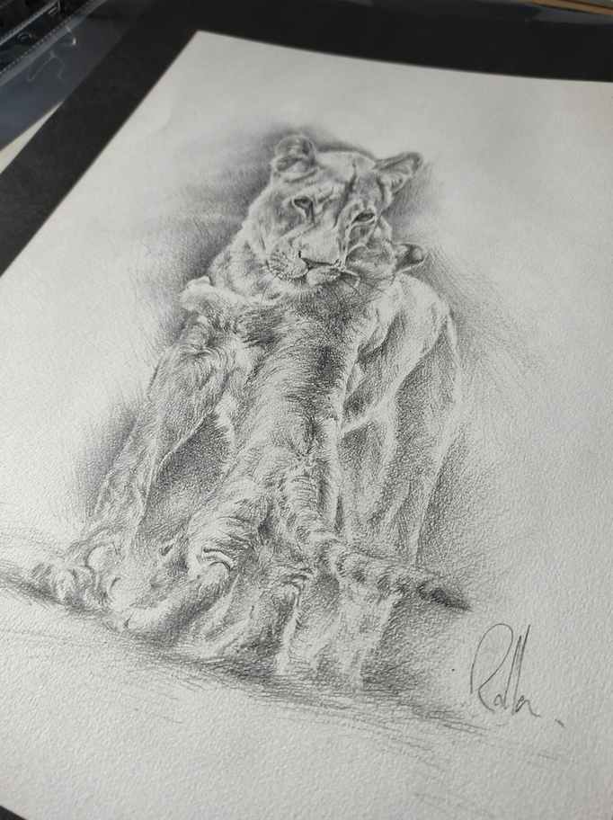 Dessin de recherche original et unique (1 unique exemplaire), fait à la main par l’artiste représentant une lionne et son lionceau